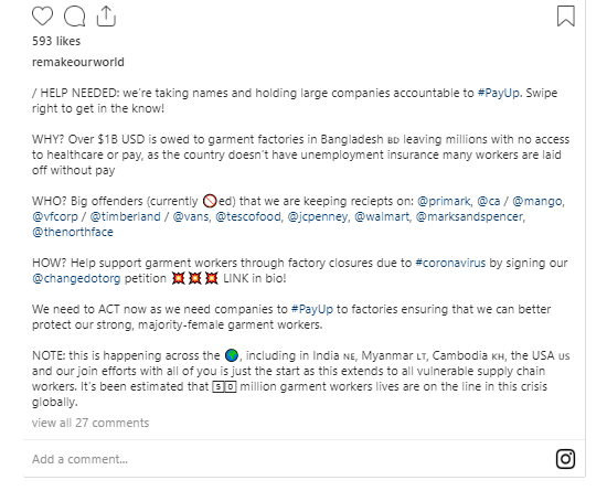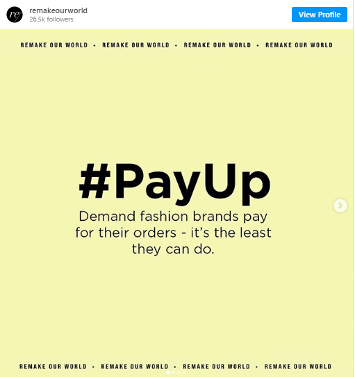 Pressure brands digitally by posting photos on social media that demands them to be socially responsible. Remake has recently launched the #PayUp online petition that calls all major fashion brands in paying their garment factories for their canceled and delayed orders because of COVID-19. They owe more than $3 billion dollars to factories around the world. The top twelve brands that need to #payup includes: Gap, Primark, C&A, Mothercare, Bestseller, Tesco, Kohls, Walmart, LPP, JCPenney, American Eagle Outfitters and URBN. Sign the petition here: https://www.change.org/p/unless-target-zara-walmart-c-a-jc-penney-payup-millions-of-garment-makers-will-go-hungry