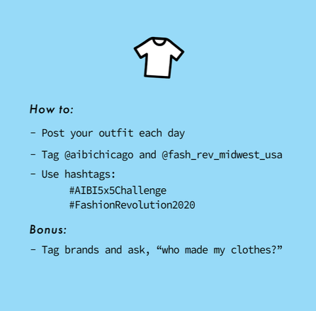 To participate, go to your closet and choose five items of clothing that you will want to combine in five different outfits for five days. From April 20-24, post one outfit each day for Fashion Revolution Week on your social media accounts. Make sure to use the hashtags #FashionRevolution2020 and #AIBI5x5Challenge and tag @aibichicago to let us know.
